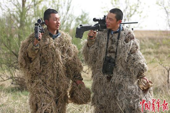 4月16日,在野外驻训的海军陆战队某旅狙击手交流训练心得。 中青报·中青网记者 王裴楠/摄
