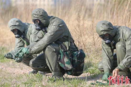 4月14日,海军某潜艇基地防化大队官兵开展训练。 中青报·中青网记者 王裴楠/摄