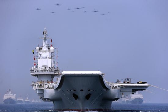 2018年4月12日上午,中央军委在南海海域隆重举行海上阅兵。图为制空作战梯队飞越航母编队上空。 张雷/摄(资料图片)