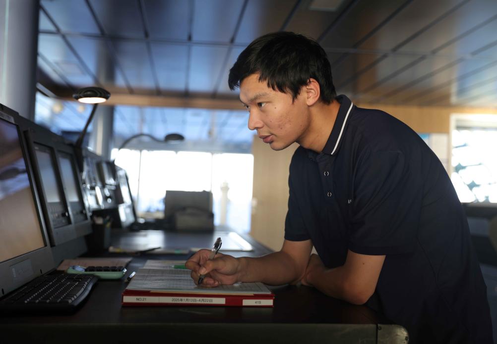5月2日,“雪龙2”号实习三副李浩玮在驾驶台值班。新华社记者 黄韬铭 摄