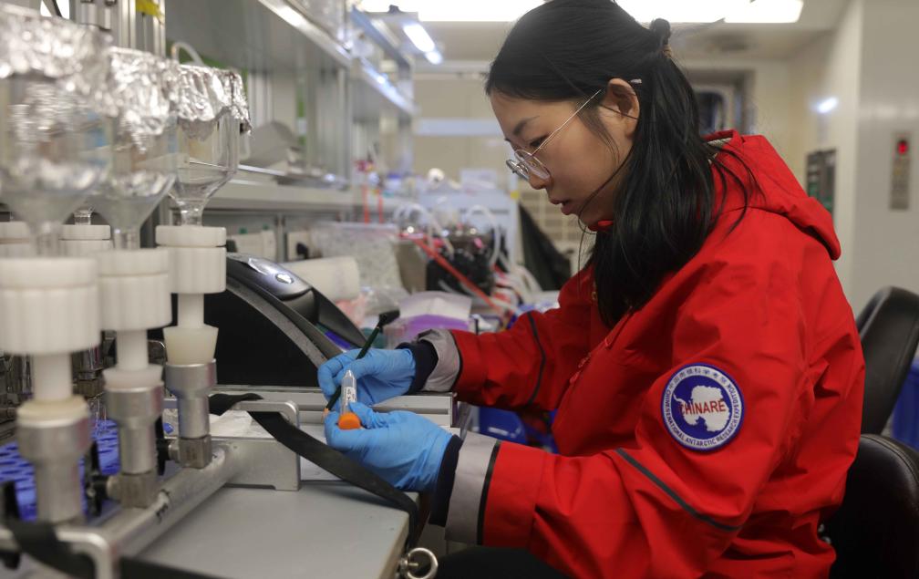 凌晨,考察队员朱洁在“雪龙2”号船载实验室工作。新华社记者 黄韬铭 摄