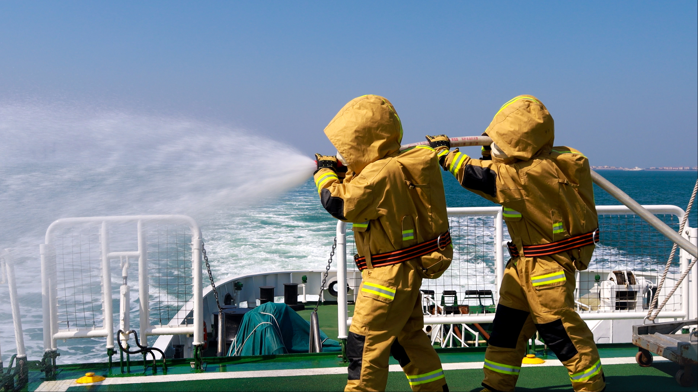在登临检查课目演练中,“嫌疑船只”发现执法编队后试图加速逃窜,指挥中心立即启动应急预案,迅速调度舰艇实施包抄拦截。执法舰艇凭借优越性能抢占有利阵位,通过高音喇叭发出警告,高速执法艇如离弦之箭抵近目标。执法人员抓住浪涌间隙,利用挂梯快速登船,战术小组交替掩护突入驾驶台和货舱,取证组同步开展证件核对、物资查验,全程规范高效,仅用十余分钟便完成对“嫌疑船只”的控制处置,展现了扎实的专业技能和快速反应能力。针对冬季海上风浪大、能见度不稳定等特点,训练还专门设置了大风浪航行、应急堵漏、消防灭火等课目,全面检验舰艇装备性能和人员应急处置水平。